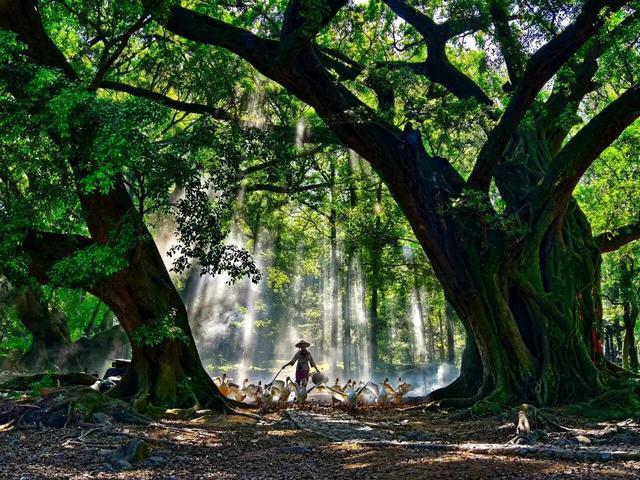 ●杨家溪:古榕树群枝繁叶茂,清晨阳光透过树叶洒下碎金,老农牵着牛从树下缓缓走过,像一幅流动的古画,意境十足。